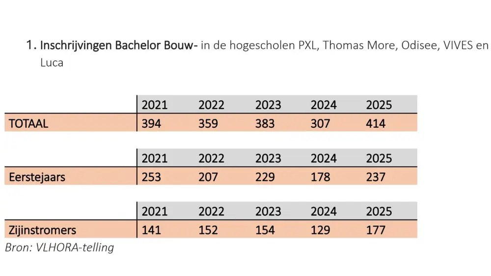 De bouwopleidingen op onze hogescholen zitten in de lift. Jaar na jaar neemt er het aantal inschrijvingen toe. De ‘bachelor bouw’ telt 25% meer inschrijvingen dan vorig schooljaar. De graduaten ‘werforganisatie’ en ‘bouwkundig tekenen’, hebben intussen 40% meer nieuwe inschrijvingen dan vijf jaar geleden.